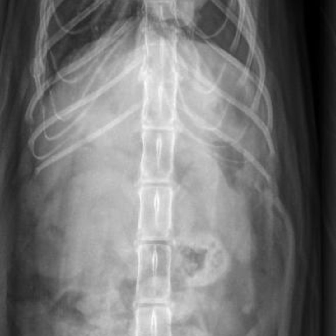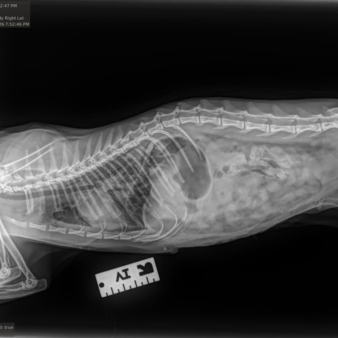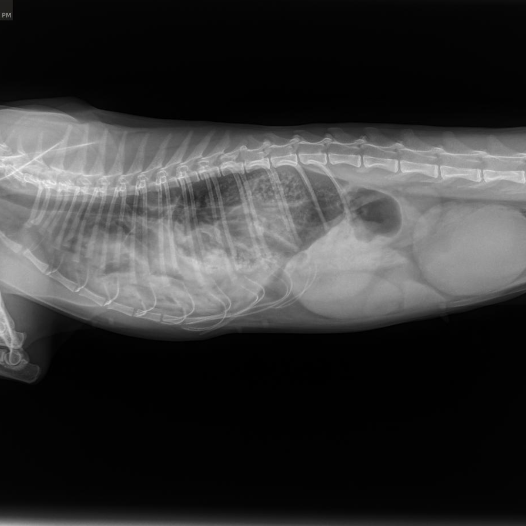Our veterinary team at the Bredel Clinic acted quickly. Diagnostic X-rays revealed a diaphragmatic hernia, along with concern for a possible internal tumor or an enlarged kidney. A diaphragmatic hernia, as seen in the X-rays below, occurs when a rupture in the diaphragm allows abdominal organs, such as the liver, stomach, or intestines, to move into the chest cavity. This condition is most often caused by severe trauma, like being hit by a car or suffering a major fall, and it can lead to significant respiratory distress, rapid or shallow breathing, muffled heart and lung sounds, and chronic weight loss if left untreated.